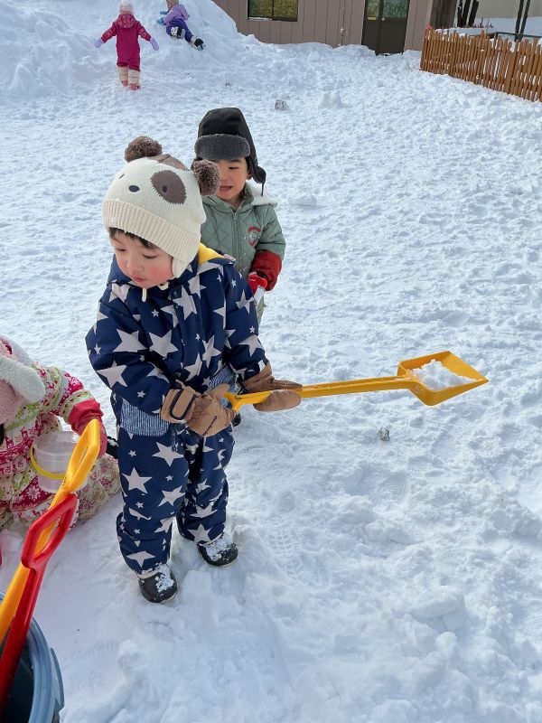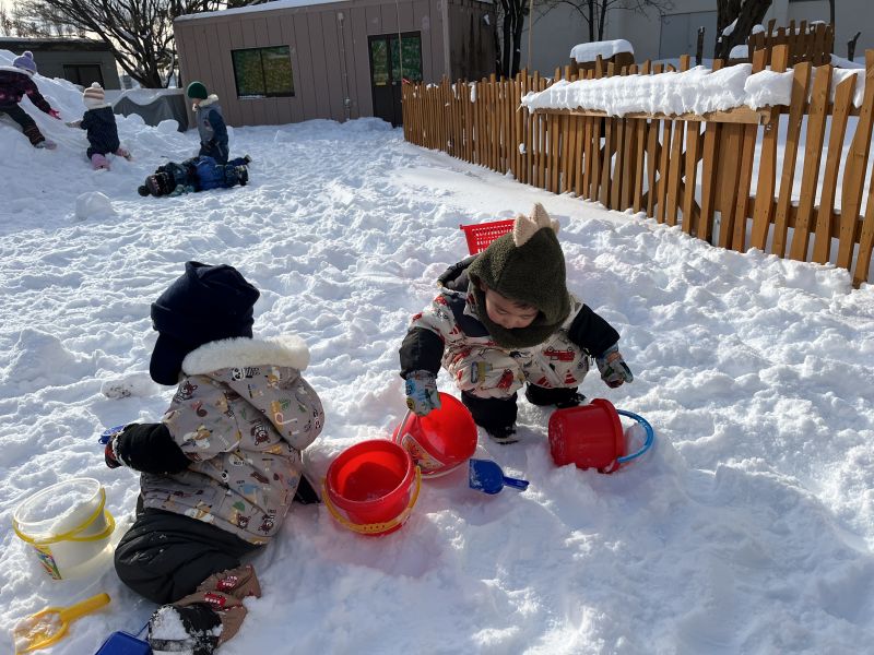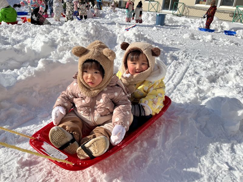 ソリに乗ったり、保育者と一緒に雪山から滑ってみたり、あちこち歩き回って可愛らしい足跡を付けながら雪を踏む音を楽しんでいますよ。