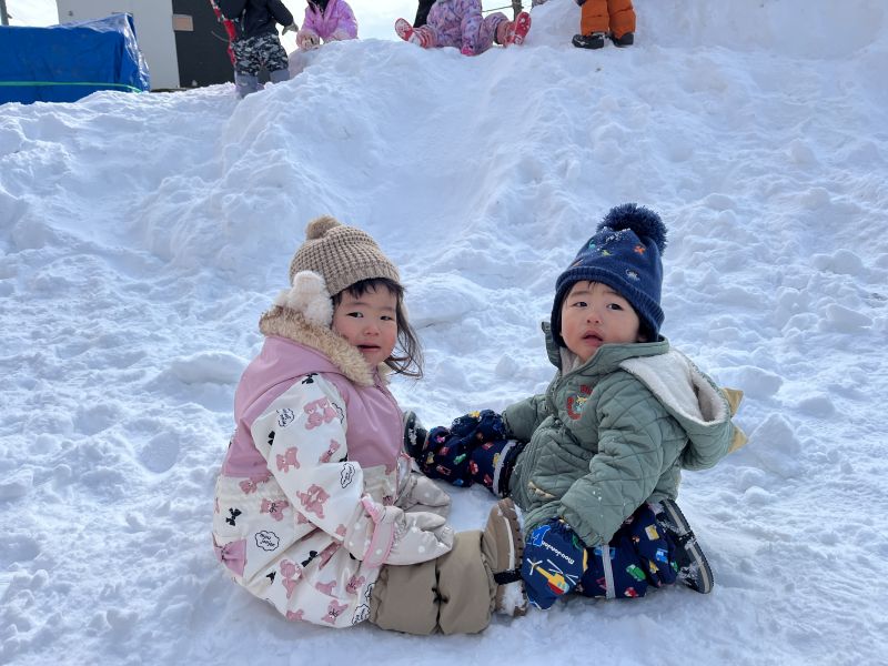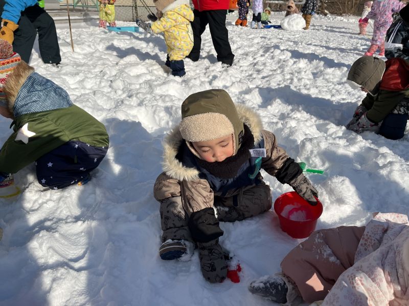 初めてのスノーウェアで思うように動けないもどかしさから泣いてしまっていた子も回数を重ねるうちに雪遊びを楽しめるようになってきました。
