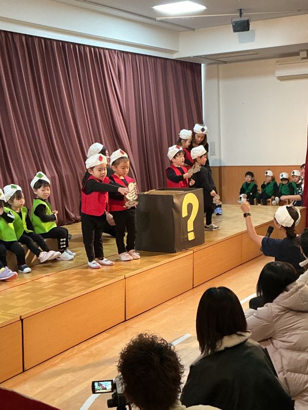 誕生児が「〇歳になりました!」と元気に発表したり、すみれ組が『変顔クイズ』、保育者がパネルシアターのお話をしてくれ、楽しい時間を過ごしました!