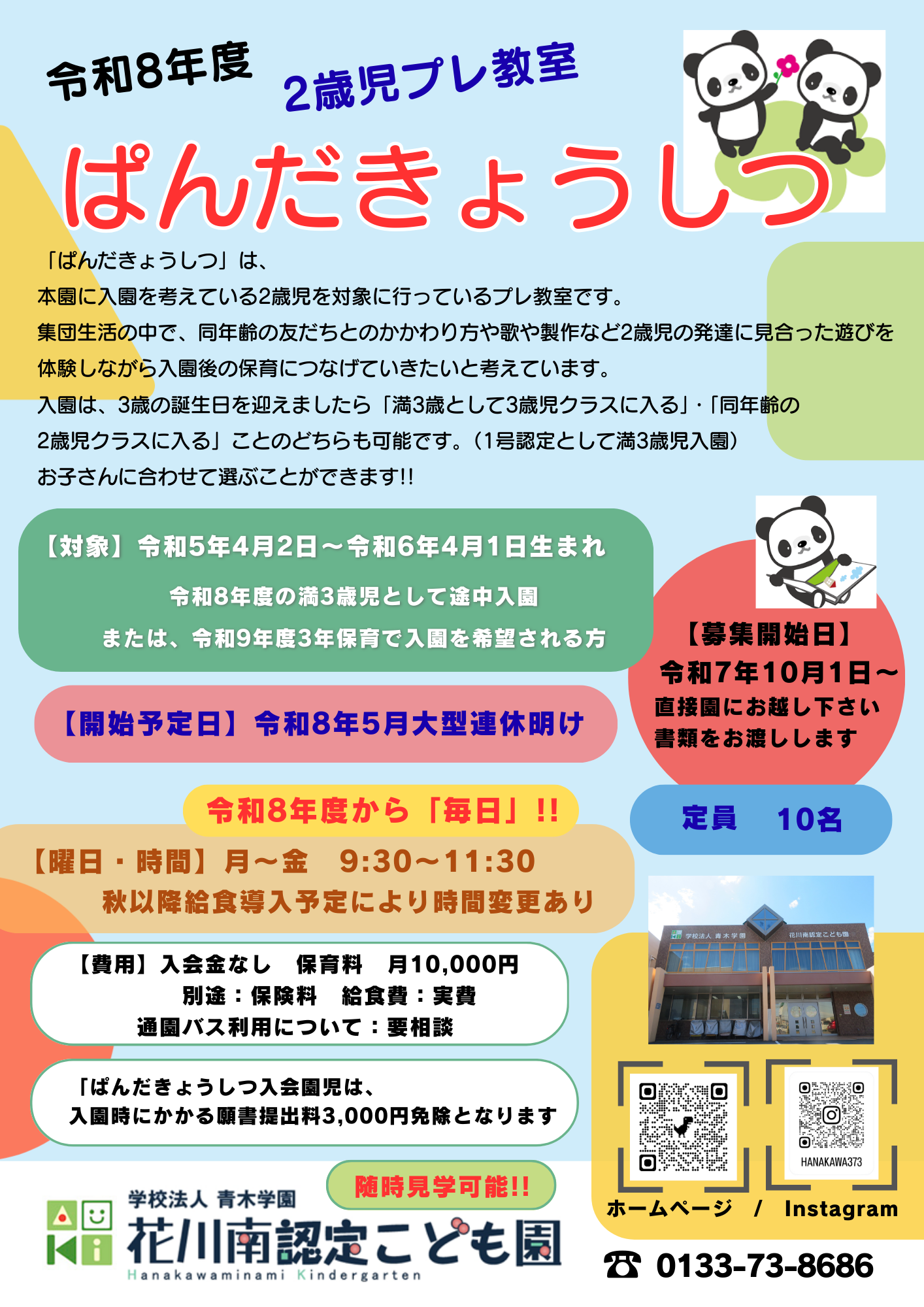 令和8年度 2歳児プレ教室の募集を開始いたします!! 令和8年度2歳児プレ教室「ぱんだきょうしつ」の募集をいたします。入園をご希望の方は、園までお越しください。園見学も随時行っておりますので是非!!お待ちしています♪ 2025-10-01