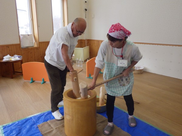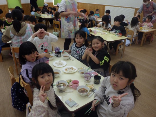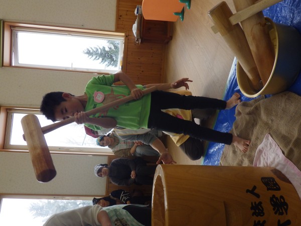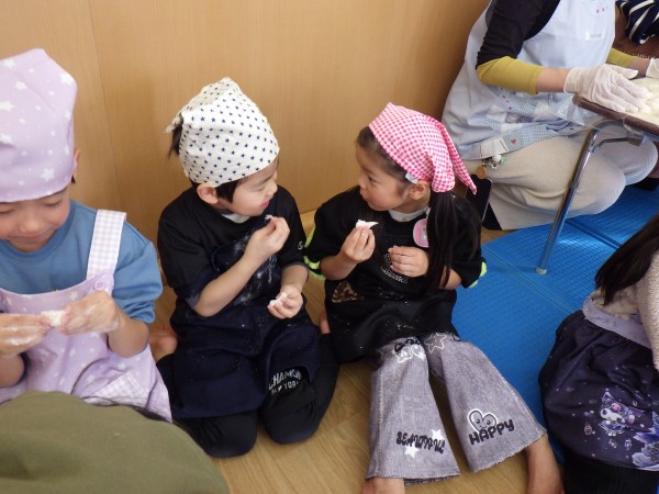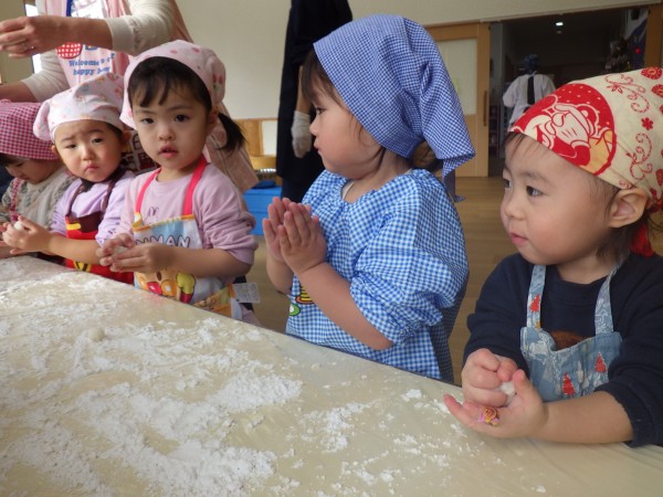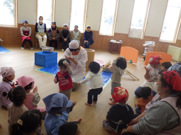 本日、もちつき会を行いました。朝からホールにうすと杵が置いてあり、おもちつきだ~と喜ぶ子どもたちでした。ホールに集まるとお米の蒸し上がるいい匂いがする中、会の始まりです。 園長先生のお話の後、今回は給食でおもちを食べるので、丁度良い大きさに丸めるのをきりん組のお母さん方にお手伝い願ったので、ご紹介させて頂きました。年末におもちをつく由来をお話した後、お手玉を使ってもちつきの遊びを見せると、いつも遊んでいるひよこ組のお友達に前に出てきてもらうと、すぐさま頭にお手玉をのせて可愛い姿を披露してくれました。次は向かい合わせで二人でするもちつきの手遊びで、きりん組のお兄さん、お姉さんが歌のリズムに合わせて軽快な手さばきでした。そうこうしているうちにもち米が蒸し上がり、臼の中へ。まずはきねでこねてお米の粒をつぶしてから、園長先生が力強くついてくれます。あいどりは武田先生で、両先生の掛け合いも和みました。子ども達のヨイショの声援を受けながらついていき、お手伝いのお母さんもついてくれました。そしていよいよきりん組の番です。一人ずつ、重たいきねを持って誇らしげな表情で交代でついてくれました。きりん組になると一人でつけるんだ~いいな~と小さいお友達も憧れの眼差しで応援していました。そのつきあがったおもちを、小さくしてもらい、ひよこ・りす組からおもちの感触を味わいました。うさぎ組からはエプロン、三角巾をつけて丸めていきます。こあら・ぱんだ・きりん組は自分で丸めたおもちを、一口味見しました。つきたてのおもちは美味しいようでした。二臼目は、年長の担任がこねて、お米がだんだんつぶれていく過程を間近で見ました。今度はこあら・ぱんだ組の二人組で重いきねを一緒に持ち、担任にも支えてもらいながら頑張ってつきました。さていよいよホールで会食です。ついたおもちは、雑煮ときな粉味で食べ、おかわり分として砂糖醬油、納豆味でも食べました。美味しい!とおかわりをたくさんしていた子ども達の表情は満足そうでした。元気で新しい年を迎えられるように、そして大きく育って欲しいと職員の願いを込めてのもちつき会を楽しく終えました。