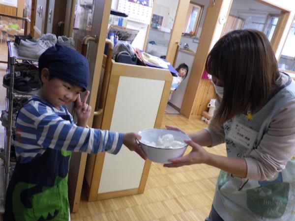 保育者やお友だちとの会話も弾ませながらお腹いっぱい食べました。