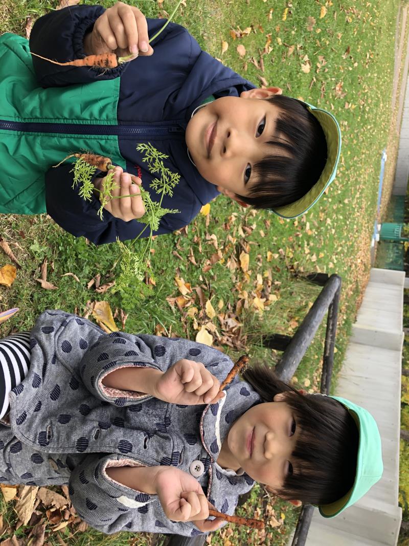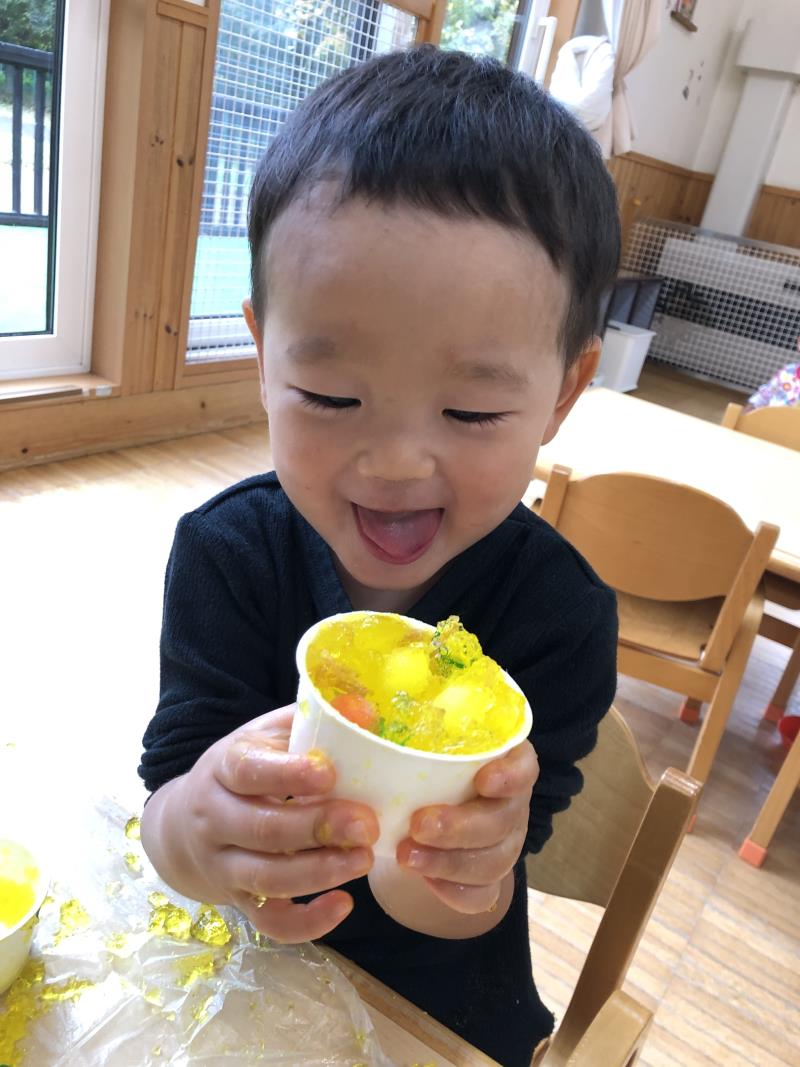 バス遠足が終わった後は、エプロンと三角巾を身に着けてレッツクッキング!今回は、きりん組の畑で育てているピーマンや、子どもたちとイオンに行き購入した野菜やフルーツ缶詰を使って『カレーライス』と『フルーツポンチ』を作りました。「おいしくなぁれ…」と魔法をかけながらカレールーを混ぜたりして真剣に料理に向き合っていた子どもたち。実食では、「おいしー!」「最高!」と口々に言い合って、自分たちで一生懸命作ったことへの達成感を味わう姿が見られました!