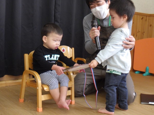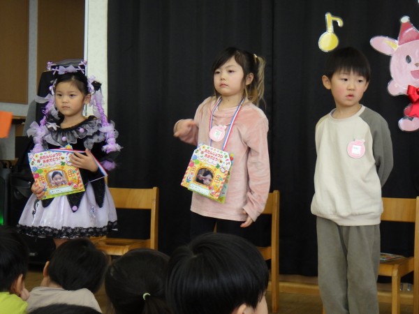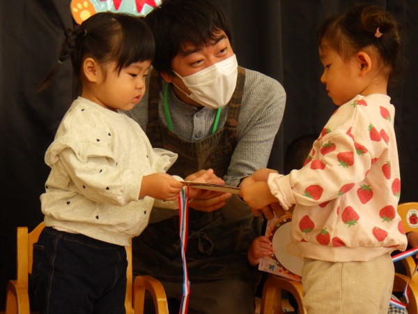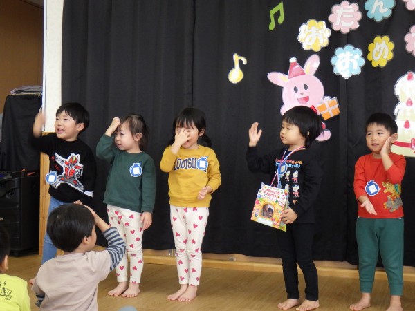 11月19日は11月のお誕生日会の日でした!“たんたんじょうび♪”の曲に合わせてドキドキな表情で入場してきた子どもたちでしたが、しっかりと椅子に座ることができ、一つ大きくなったステキな姿を見せてくれました!今回の質問は“好きな玩具はなんですか?”緊張から答えるのが難しい姿もありましたが、滑り台や本、ベイブレードやフラフープなど好きな玩具をたくさん教えてくれました!そして今回の歌の発表はこあら組さんが“こぎつね”を披露!大きなしっぽを振る仕草や小首をかしげて考える姿がとても可愛らしかったです!みんなのお楽しみ!先生からの出し物では、秋のマジシャンオータム仮面とみかよちゃんがお絵描きマジックを行いました!絵に描いた“りんごや柿、縄跳び”などが子どもたちの「ワン・ツー・スリー!」の掛け声で本物になると子どもたちは「えーっ!」「すごーい!」と大興奮!11月の季節感を味わいながら楽しんでいた子どもたちでした!11月生まれのお友だち、お誕生日おめでとうございます!子どもたちにとって幸せな一年になりますように♪